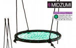 Качели-гнездо Midzumi выполнены из металлической рамы диаметром 100 сантиметров, с дополнительной защитной оплеткой ее бортиков, обтянутых прочным синтетическим канатом толщиной 10 мм выдерживающим нагрузку 100 кг. Плетеное синтетическое сидение качелей удобное и практичное, не собирает грязь и воду, при сильных загрязнениях его можно протереть.